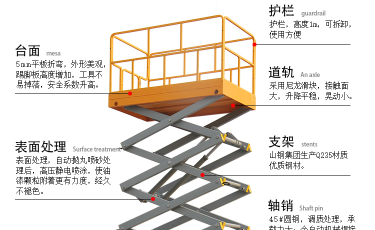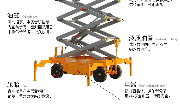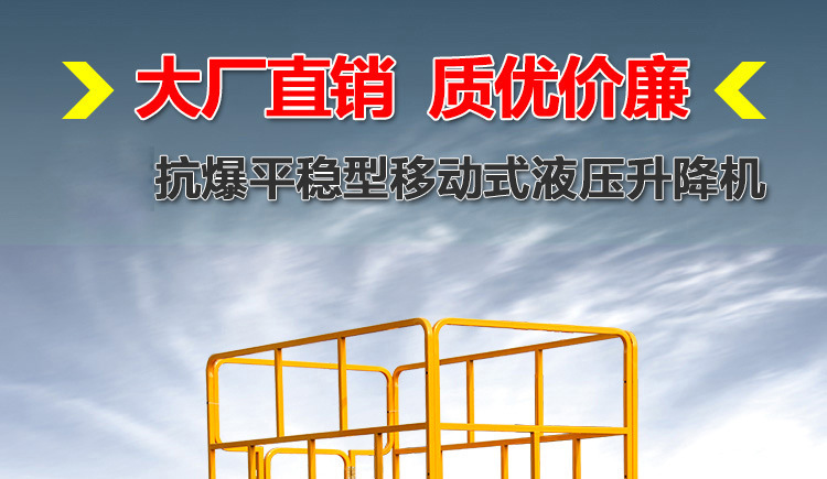 移动式液压升降机为四轮移动式,采用高强度矩形管、外形美观、移动灵活、操作简单、承载能力大、升降平稳、安全可靠,可供多人同时作业。